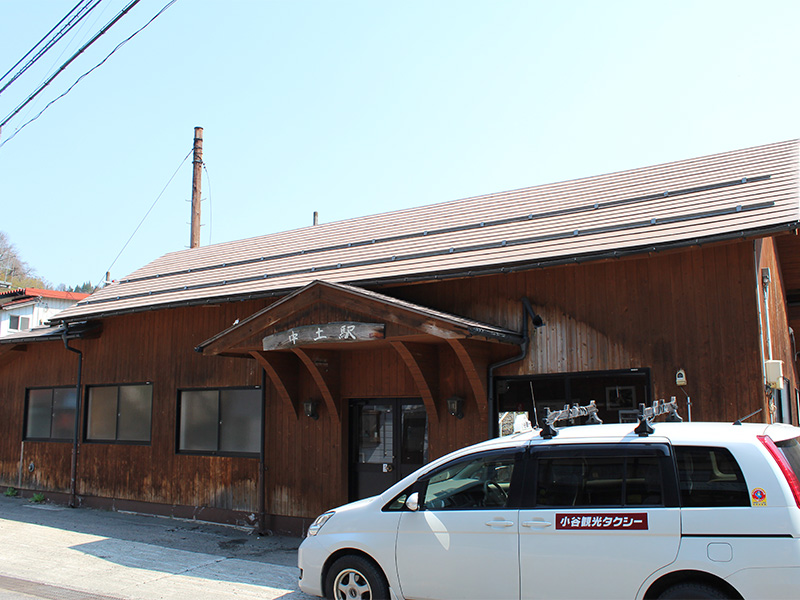 外板に使用されているのは地元産の木材でしょうか。客待ちのタクシーは常駐というわけではなく、駅前に営業所があるだけのようです。