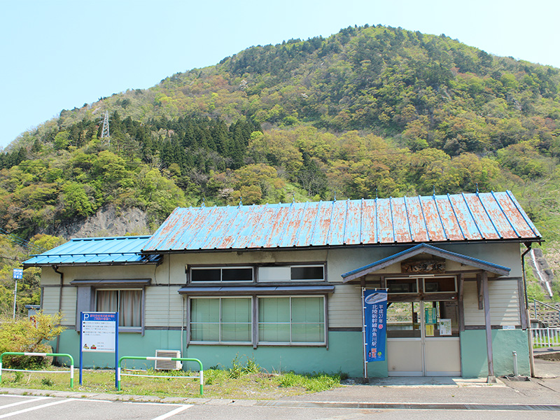 トタン屋根の古い木造駅舎です。あたりには発電所があるだけで、集落からは離れており、閑散としています。周囲は急峻な山が聳え、いつ崩れてもおかしくなさそうな雰囲気です。まったくもってよく線路をひいたものだと感心します。