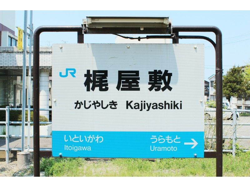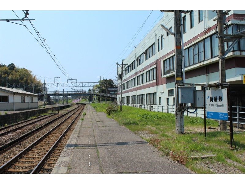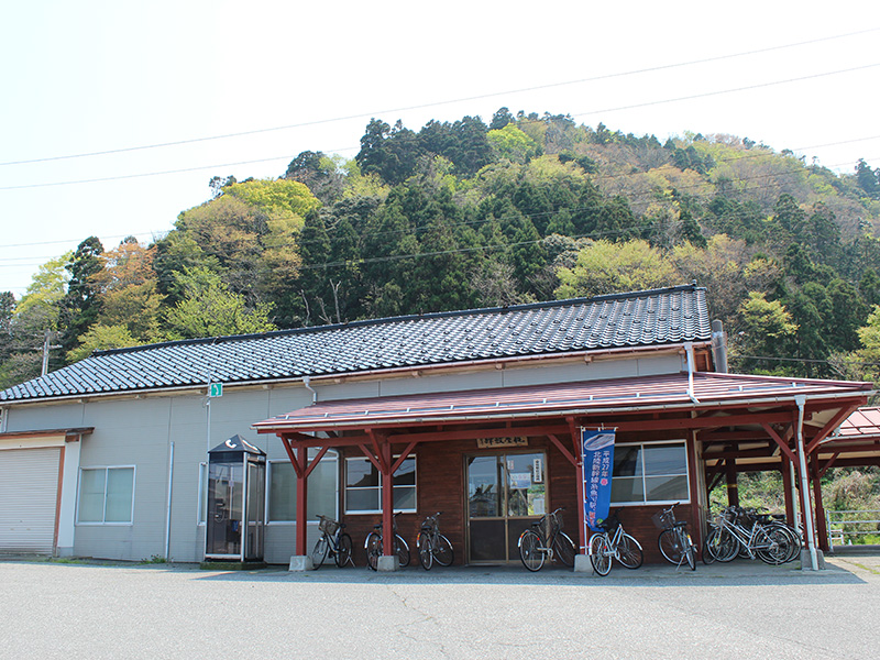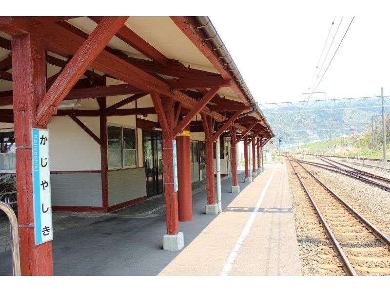 北陸地方に多く残る回廊付きの木造駅舎です。入口回りのみ外板が補修され、庇の色も赤く塗られ、オシャレな感じがします。