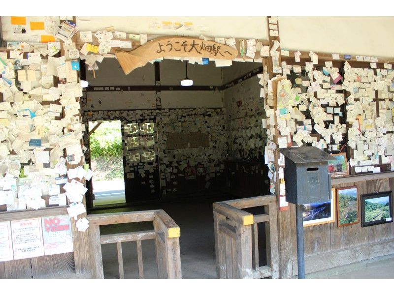 大畑駅とスイッチバックは非力な蒸気機関車のために設けられたそうです。ループ線の中にスイッチバックのある駅は大畑駅が全国唯一で、多くの鉄道ファンが駅に訪れ、駅舎の待合い室内には訪れた人たちの名刺が貼られています。