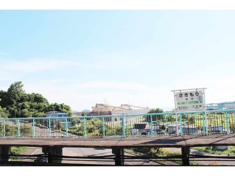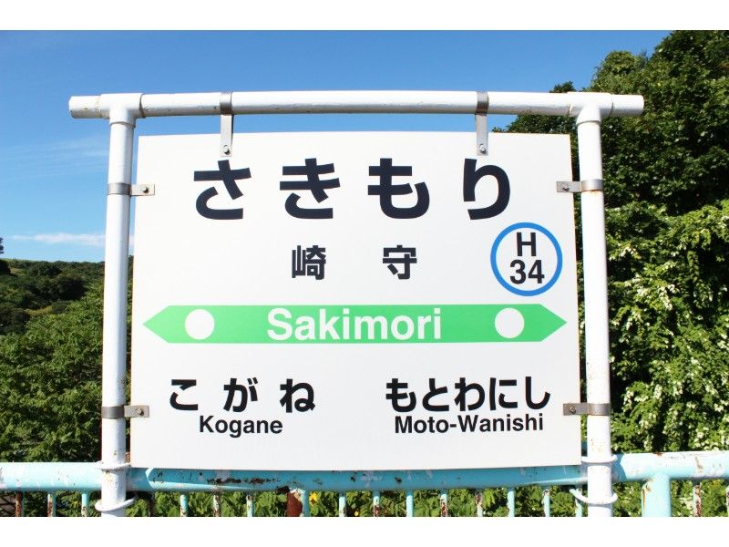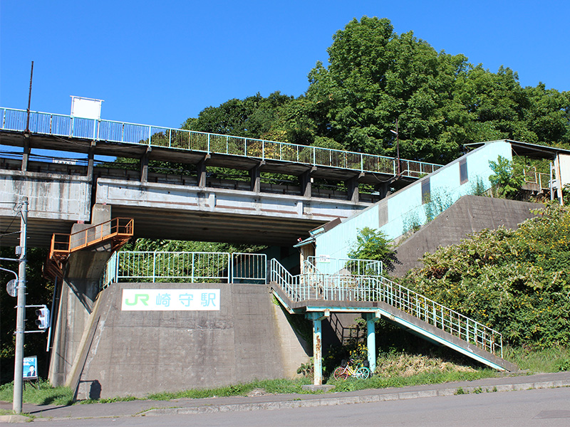 トンネルに挟まれた駅で、岩手県の三陸鉄道によくあるタイプの駅で、ホームまでは長い階段を登らなければなりません。途中の高架下に待合室がありましたが、放火やいたずら書きが激しく、撤去されてしまったとのことです。地名の由来は、幕末にここの砲台を守った人たちが神社をまつり、「崎守の社」としたのが始まりとのことだそうです。