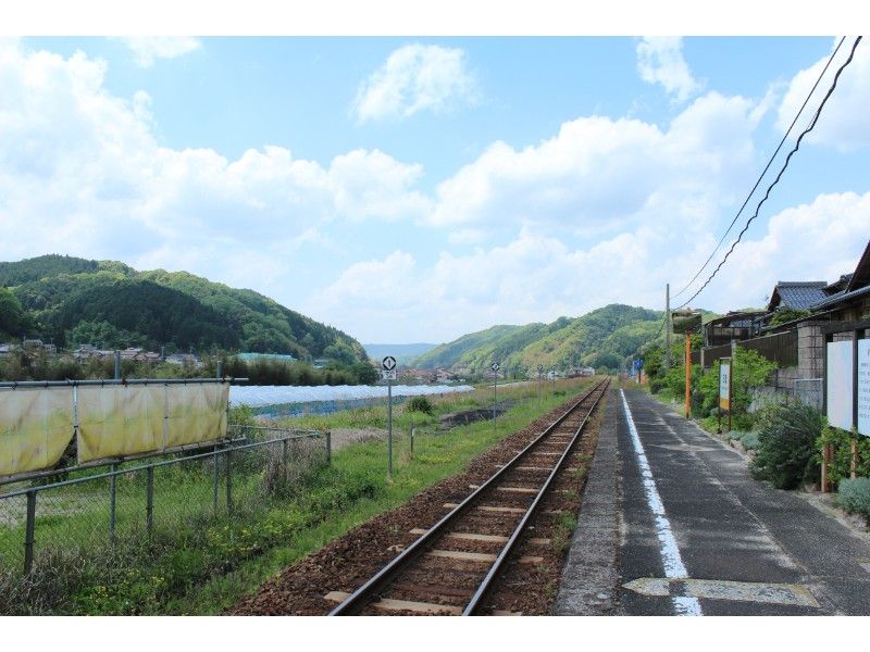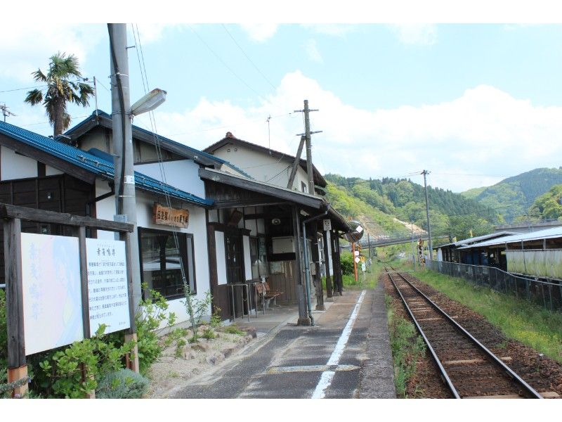 青いトタン屋根の木造駅舎です。駅前にある1本のヤシの木が特徴です。駅の北東にある御室山の中腹には大蛇退治で知られる須佐之男命を祀った布須神社が建っており、観光客の姿もちらほら見られるようです。