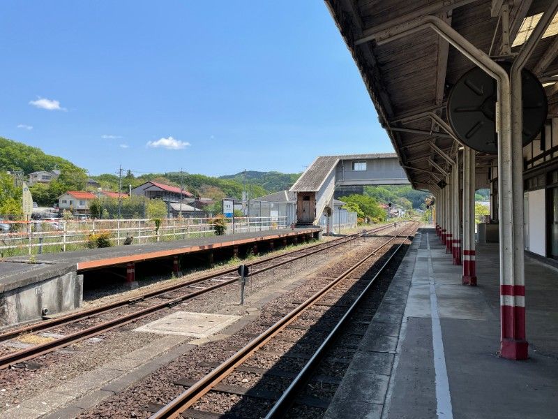 かつての繁栄を示す、瓦屋根の大きな木造駅舎です。利用客もわずかなローカル線の駅としてはよく手入れされています。