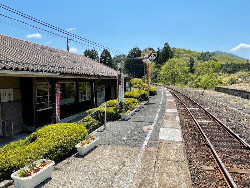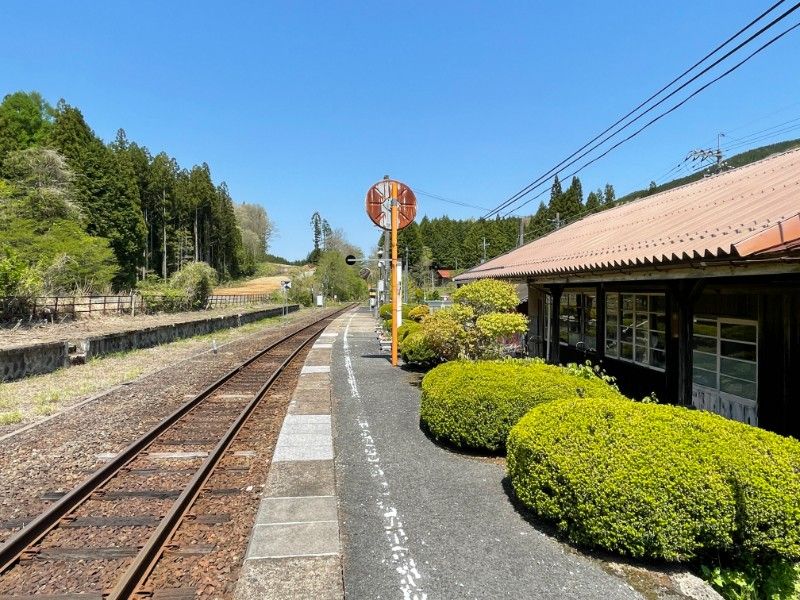 古い木造駅舎です。かつての駅事務室部分は消防団の車庫に使用されています。