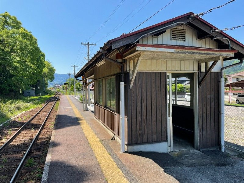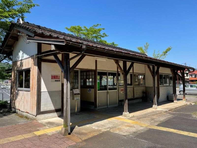 古い木造駅舎です。駅前広場は広く、かつては地域の交通拠点として重要な役割を果たしていた様子がうかがえます。