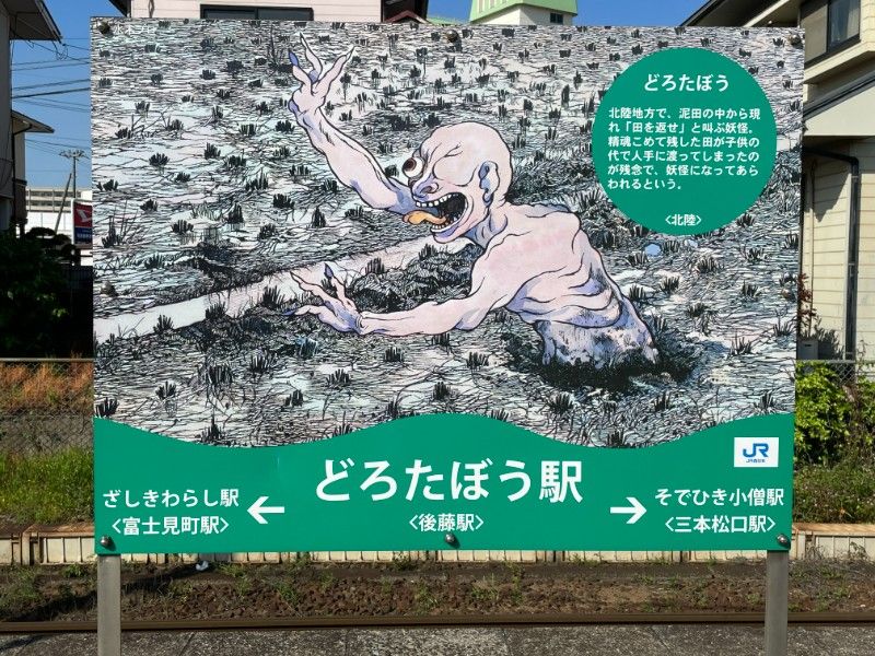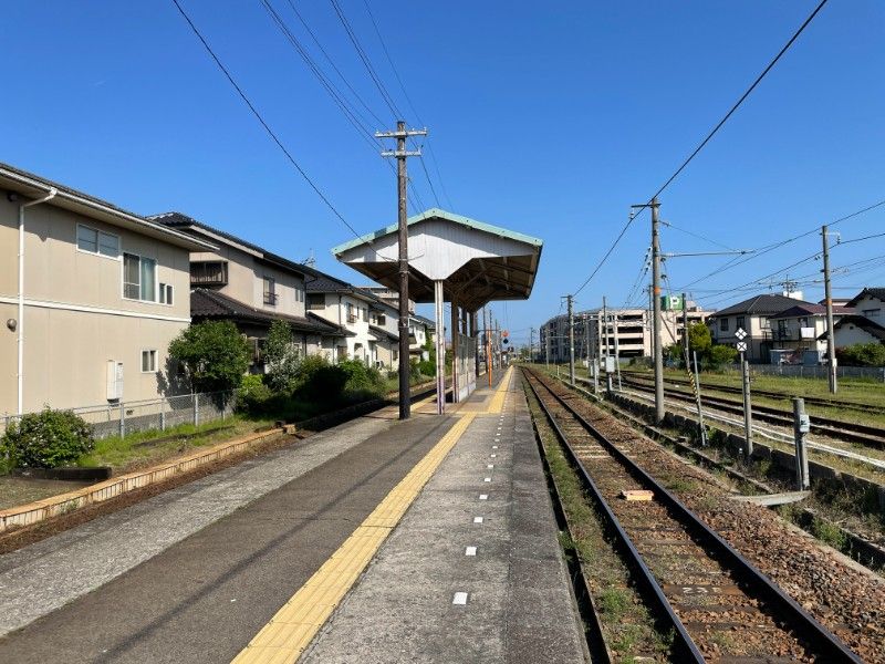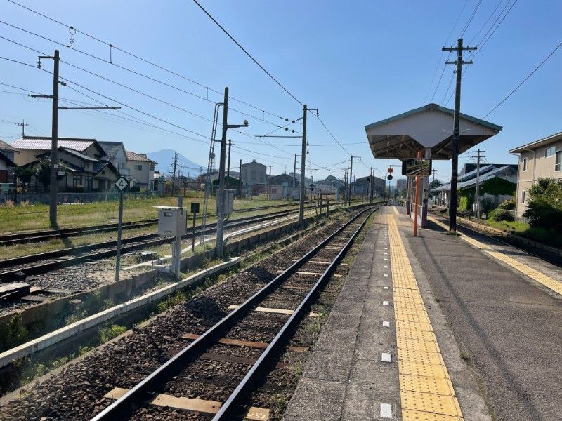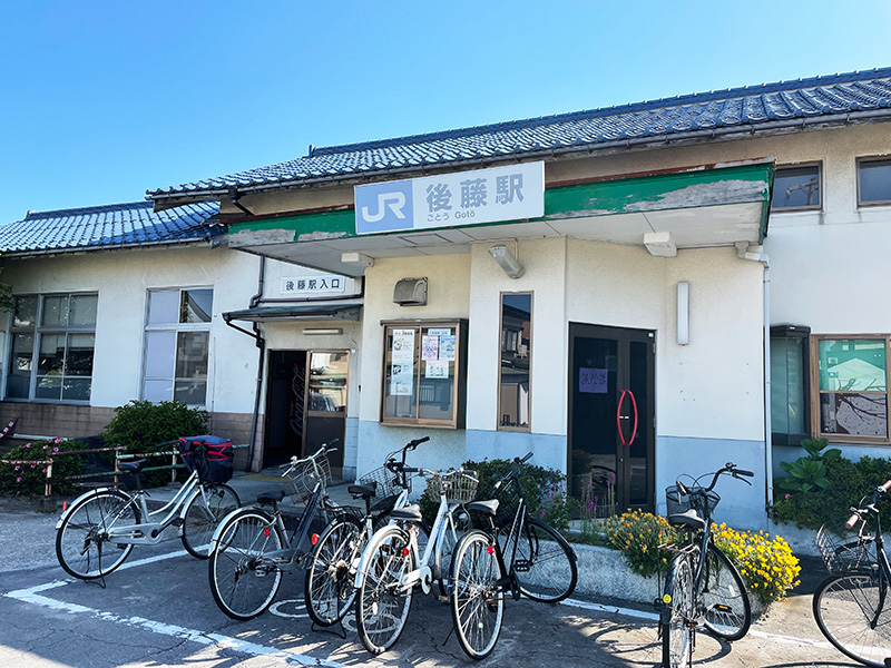 屋根の高い大きな木造駅舎です。現在は無人駅となっており、事務室にはJR西日本の子会社が入居しています。