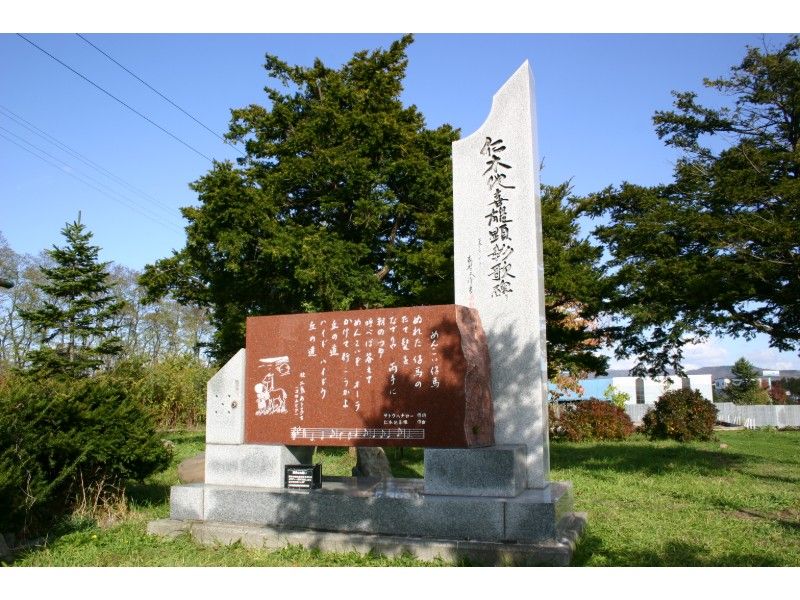 駅横に童謡「めんこい仔馬」の歌詞が書かれた、作曲者である仁木他喜雄の顕彰碑が設けられています。