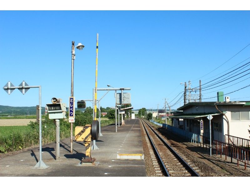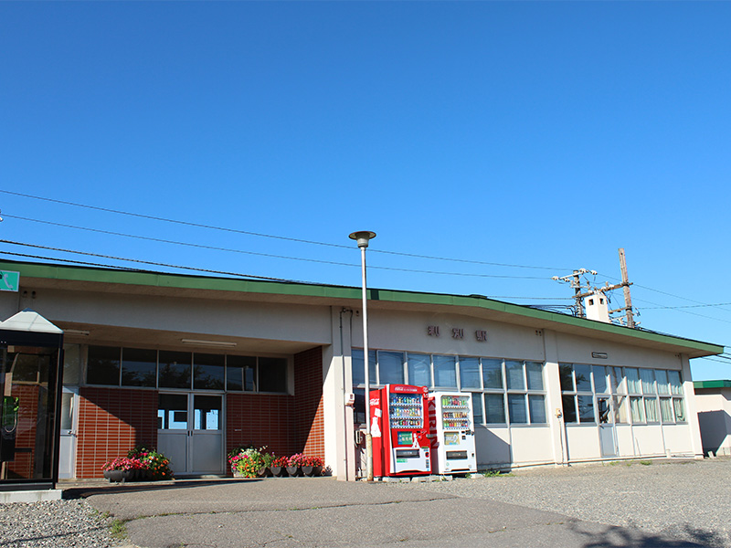 平原の中に簡素な屋根つきの島式ホームがある、のどかな駅です。
