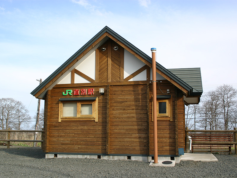 まわりの牧草地にあった緑の屋根と木造りの新しい駅舎です。