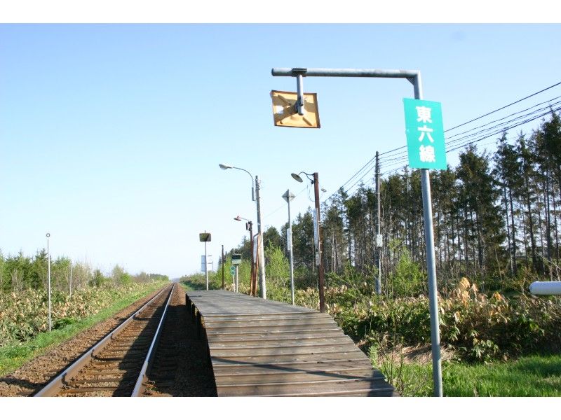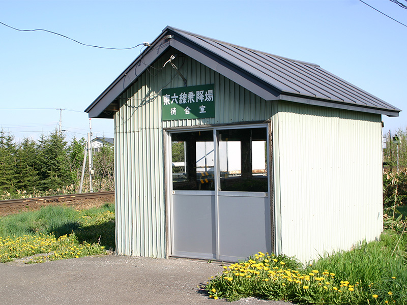 東六線というのは、いかにも北海道的な駅名ですネ。人工林に囲われた木造のホームからは一直線の線路を望み、これもいかにも北海道的です。道路が直角に交わったところに駅があり、「東六線乗降場待合室」と書かれた小屋には味があります。