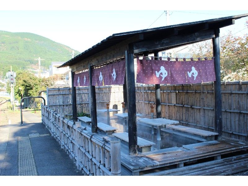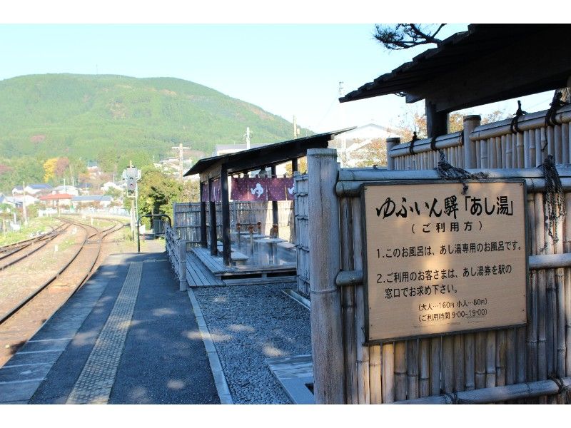 1番のりばの日田方向のホーム端には足湯がありました。入場券とは別に、同額の足湯券(大人160円、小人80円)を購入することで利用でき、絵葉書にもなる足湯券のほか、手ぬぐい1枚がついてきました。男女共用の足湯の他、周囲に壁が張り巡らされた女性専用の足湯もありました。