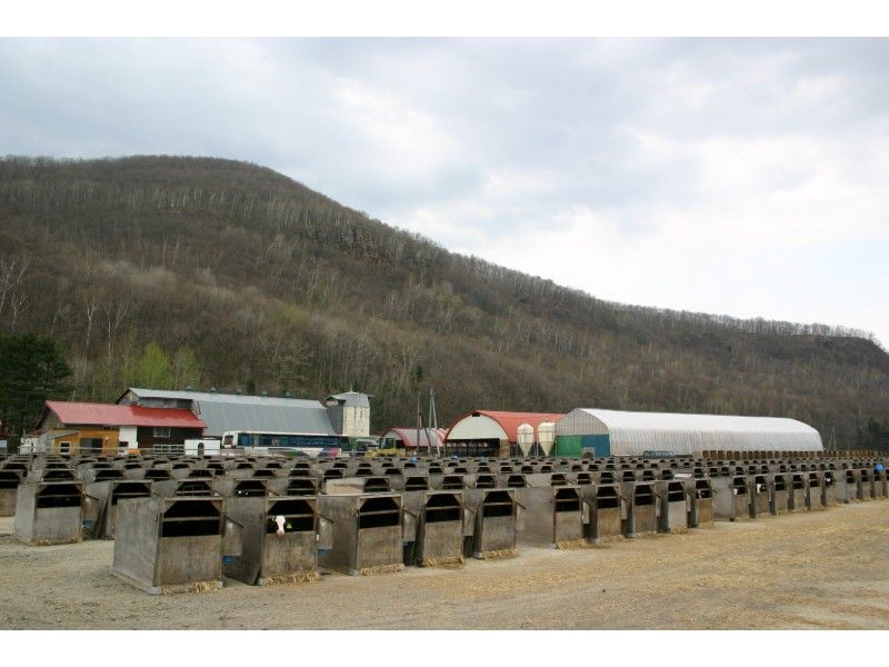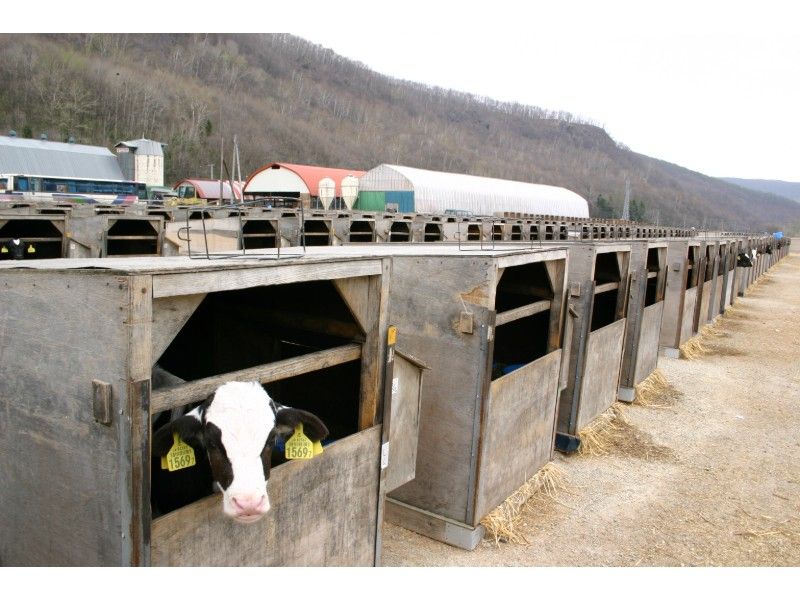下白滝の駅前は、子牛がケージにたくさん入っている牧場だけです。