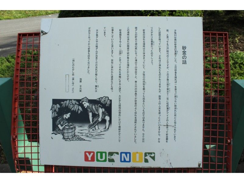 砂金堀りをする人を「山師」と言ってそれを本職にする人達で、大正から昭和の初めにかけて幾組かがここで仕事をしていたと言いますし、採取に使われた道具なども残っています。