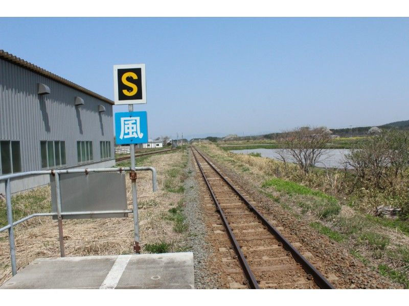 ホームの先端には風に注意するようにといった面持ちの標識が設置されており、大湊方面を望むと風力発電の風車が建てられていました。いかに風が良く吹く場所であるということが想像できます。