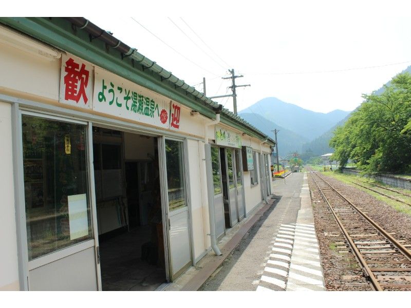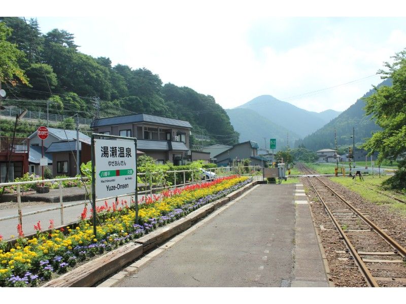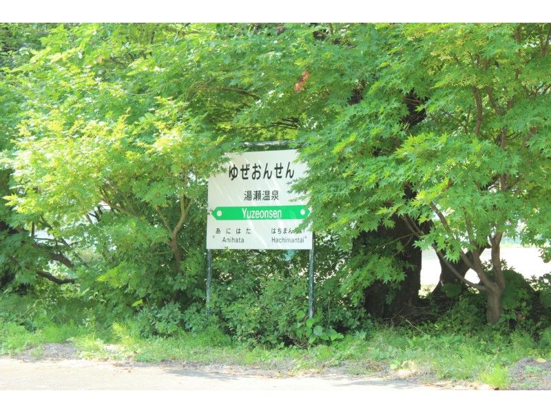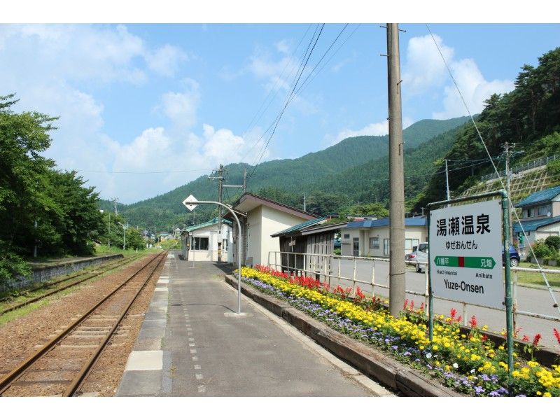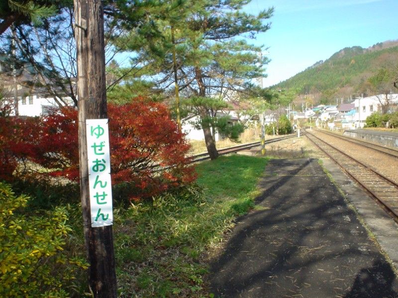 江戸時代から湯治客で賑わった湯瀬温泉の玄関駅ですが、現在は車利用が大半で、観光客の姿もなくひっそりとしていて、木製の看板が唯一観光地であることを主張しています。