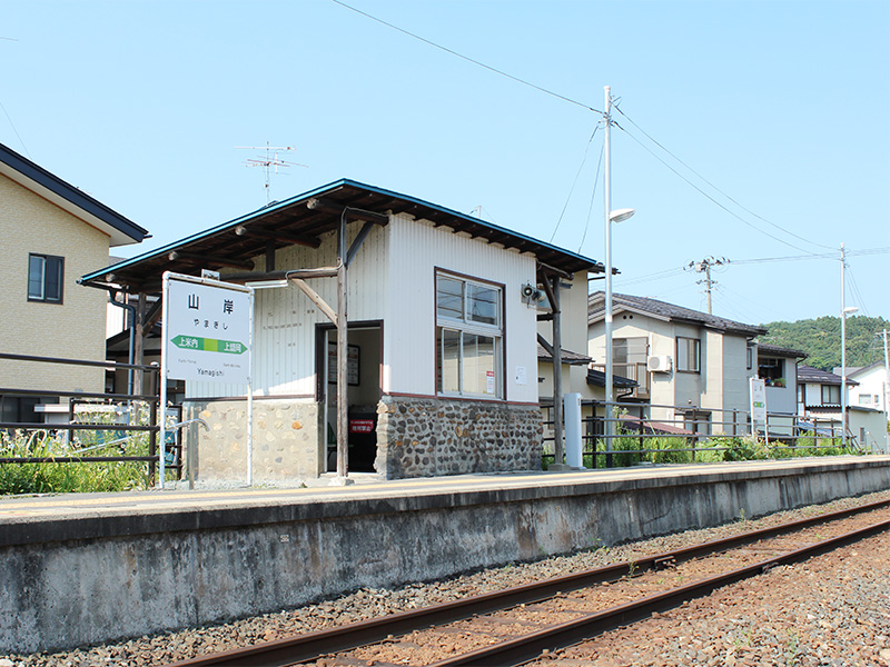 山岸駅は住宅に取り囲まれた駅です。付近には生協や商業施設もあってすごく便利そうですけど、駅前広場や駐車場は用意されていません。道が狭くて訪れるのにたいへん苦労しました。駅のすぐそばには踏切がありますけど、ここも車1台が通るのがやっとの広さでした。