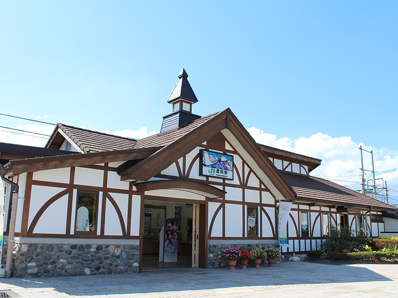 平成22年に改装された尖塔付きの洋風木造駅舎です。