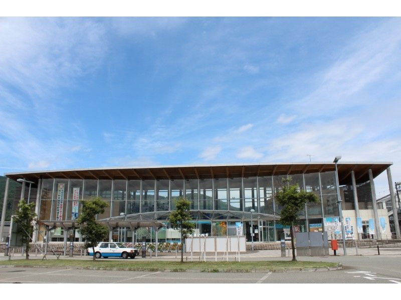 ガラスをふんだんに使用しながら屋根は木製という、斬新な中にもぬくもりの感じられる駅舎です。大半を観光案内所が占めており、駅部分は右側の1/3ほどです。
