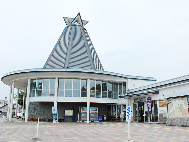 売店や多目的ホームなどが入った「大江町交流ステーション」を併設した大きな駅舎です。駅前広場も整備されています。