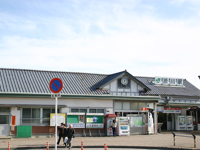 市の玄関口らしい堂々とした木造駅舎です。「日本のへそ」を自称し、駅前広場のタイルには日本地図が描かれています。