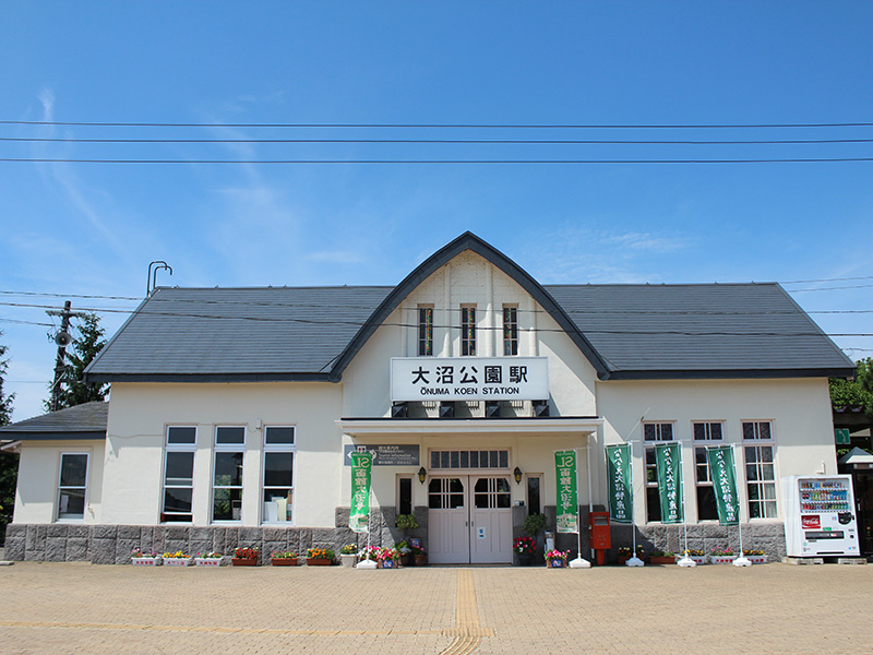 大沼と小沼ふたつの湖にはさまれた陸地に駅は建っていますが、女性的なラインを持つ三角屋根とタテ長に統一された窓のしゃれた建物です。