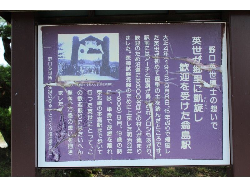 駅前ロータリーの中心部には松の木が植えられ、野口英世が帰国時に降り立った駅とのことで、石碑や立て看板が設置されています。