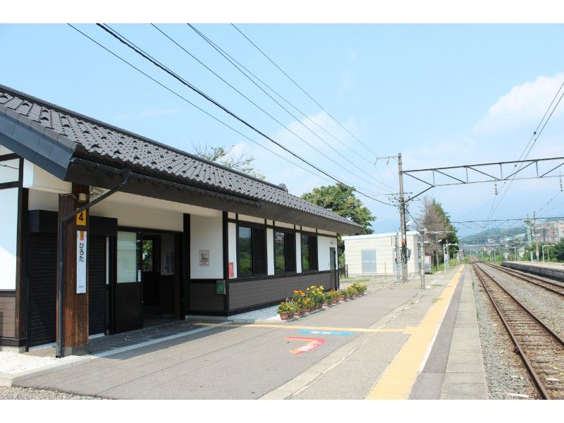 白壁の和風木造駅舎です。駅前の庭園もよく整備されています。