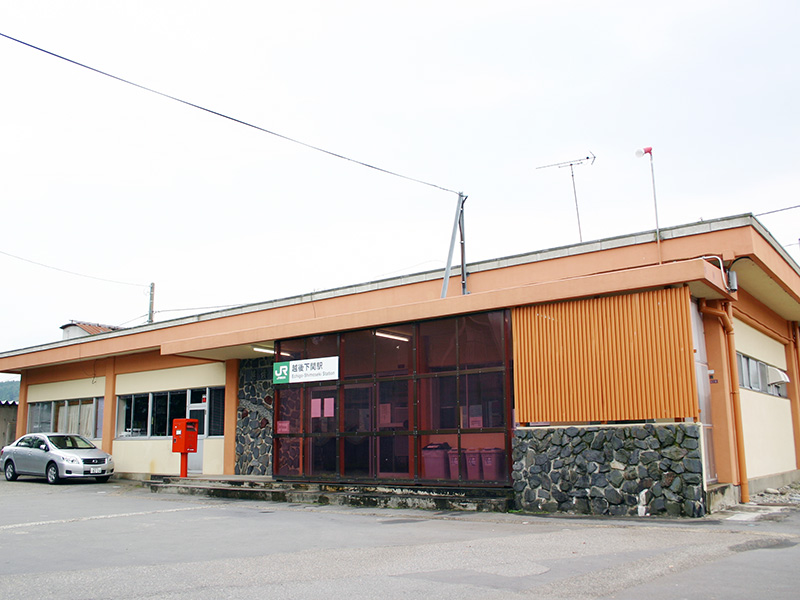 新潟県に多く見られる平屋のコンクリート造駅舎です。レンガ色に塗られた柱や前面の自然石の装飾など、精一杯オシャレをしているようです。