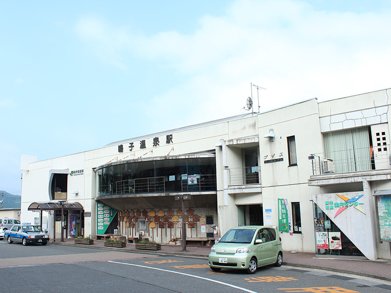 2階建てのコンクリート造駅舎は、温泉街の駅らしく1階の窓下には足湯が設置されています。