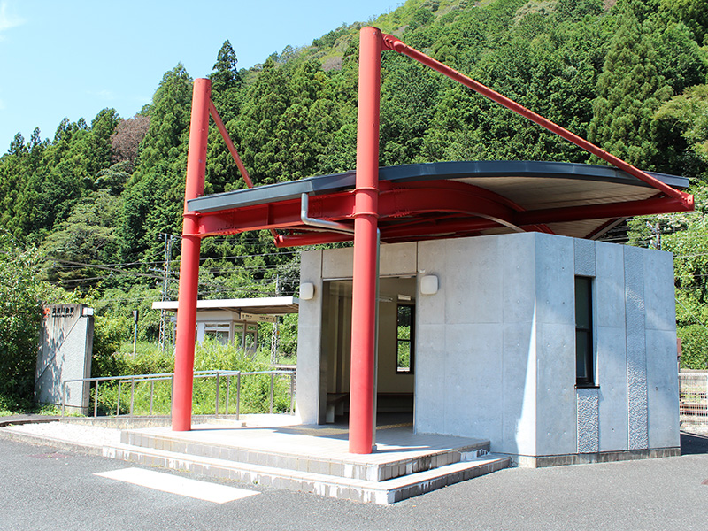 赤い柱と独特の形状を持つ屋根に目を惹かれるコンクリート造駅舎です。何をデザインしたのかは相変わらず不明です。駅名板が駅舎ではなく、左のトイレ前にある壁に表示されているのも謎です。