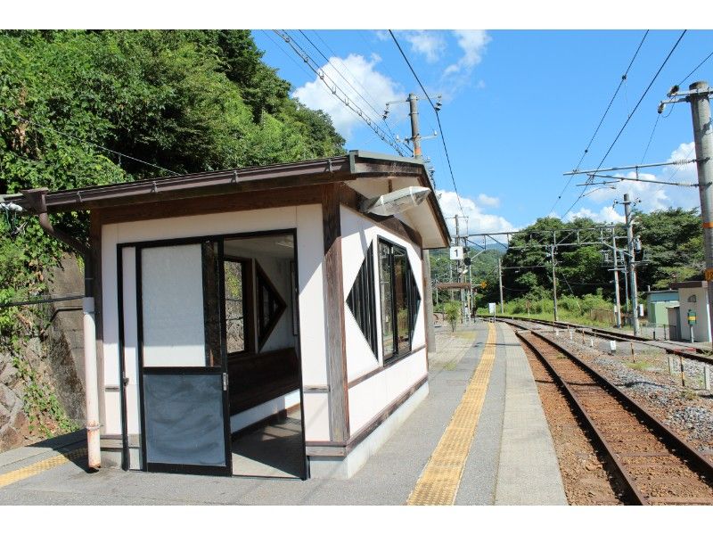 駅舎はなく、ホームに待合室が設置されていますが、四角と三角の窓がオシャレで特徴的です。